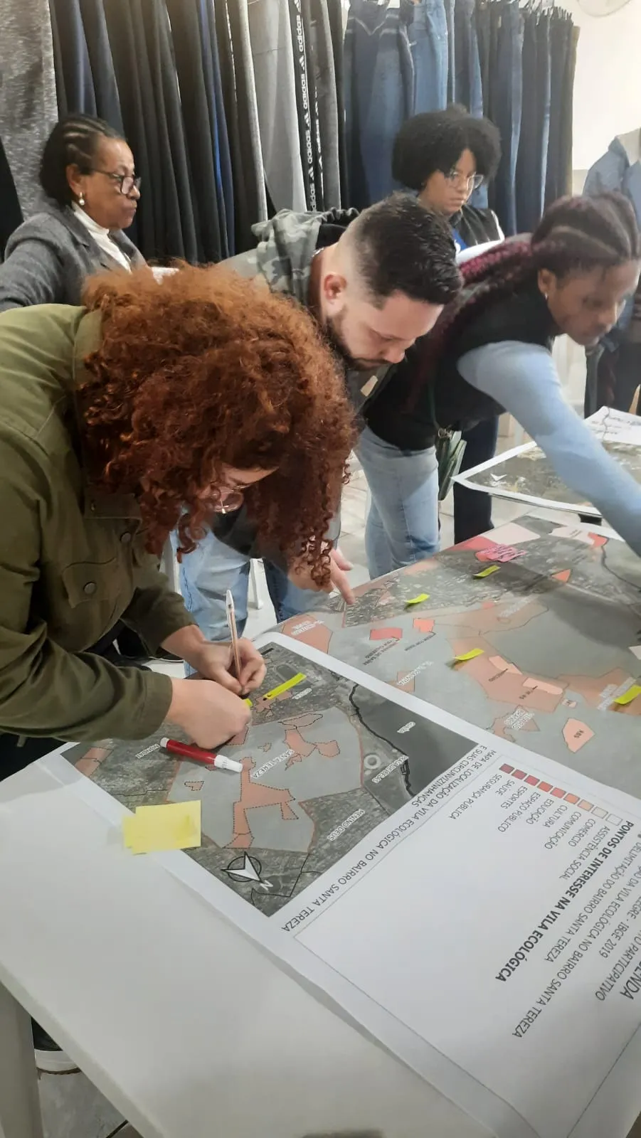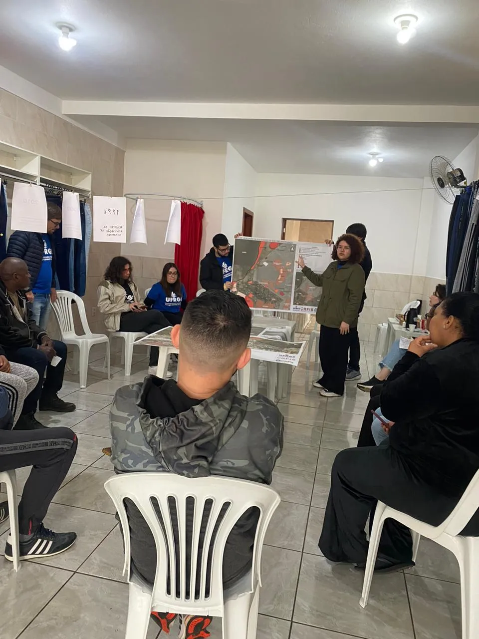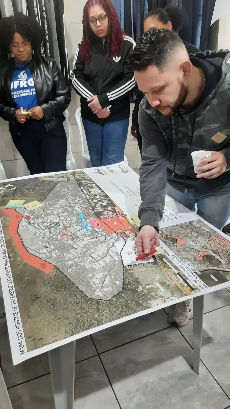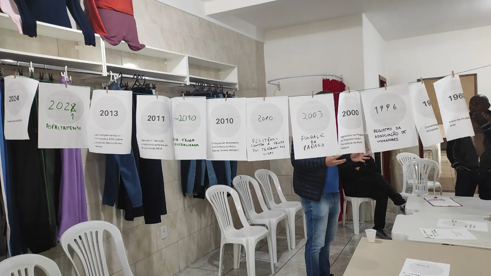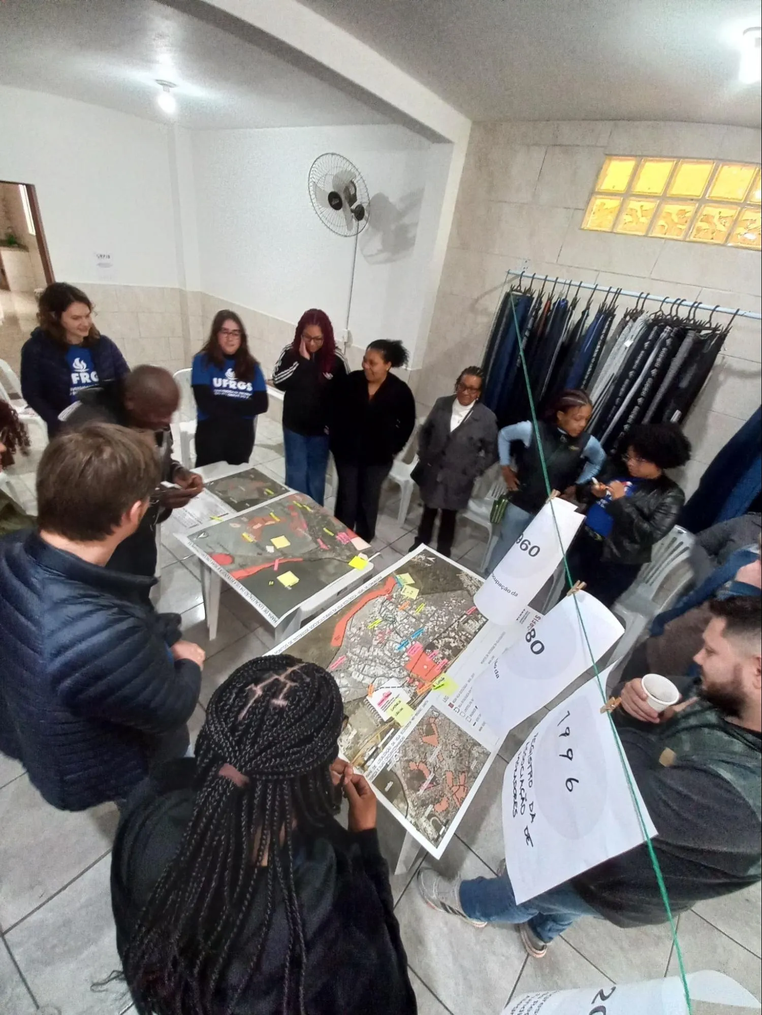 No dia 17 de agosto de 2024, membros do núcleo Porto Alegre fizeram uma oficina com a participação de moradores e lideranças da Vila Ecológica. A oficina foi realizada na loja pertencente a uma liderança local. Na ocasião, foram apresentadas as versões preliminares da linha do tempo da comunidade e dos mapas da comunidade elaborados pela equipe. Depois disso, os moradores e as lideranças comunitárias puderam contribuir, apontando elementos que precisavam ser acrescentados sobre a história e o território da comunidade, intervindo diretamente no varal montado para expor na linha do tempo e nos mapas preliminares que foram levados. O evento representou um passo importante para o andamento da pesquisa, além de ter propiciado uma apropriação dos interlocutores da Vila Ecológica com o processo de pesquisa e fortalecido sua relação com a equipe do núcleo.